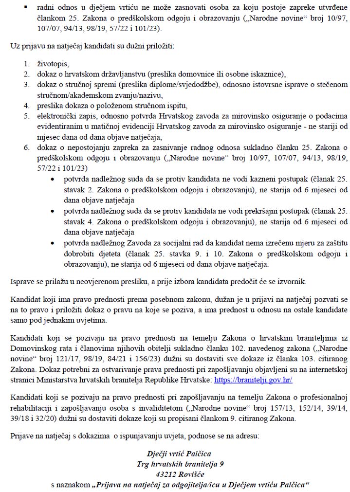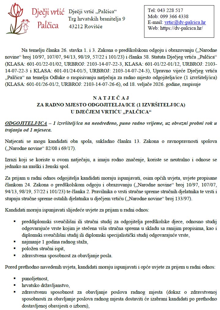 N a t j e č a j za radno mjesto odgojitelja/ice