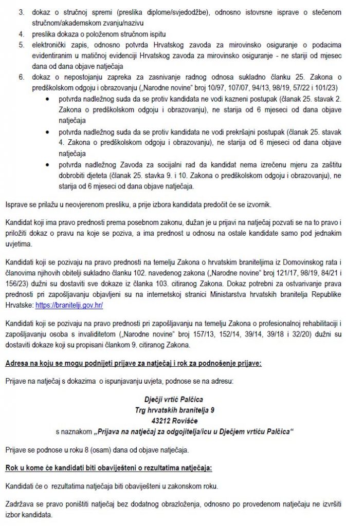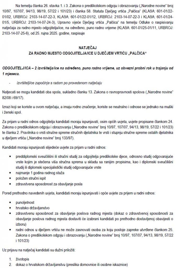 Natječaj za radno mjesto odgojitelja/ice 30/09/2025PalčicaNatječaj TEKST-NATJECAJA-ZA-RADNO-MJESTO-ODGOJITELJAPreuzmi