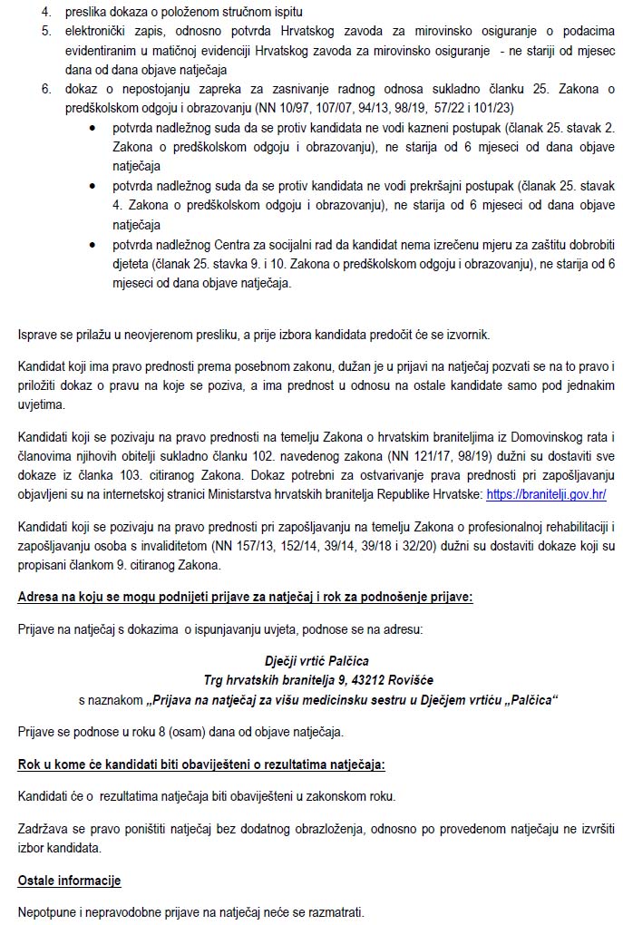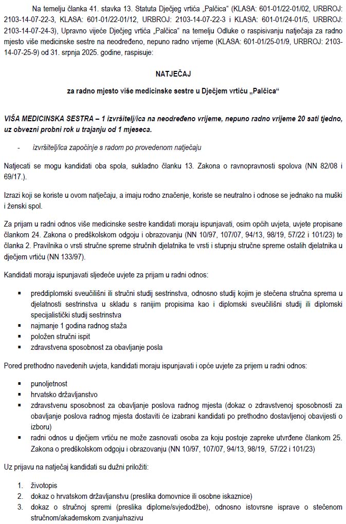 NATJEČAJ za radno mjesto više medicinske sestre 18/08/2025PalčicaNatječaj TEKST-NATJECAJA-ZA-RADNO-MJESTO-VISE-MEDICINSKE-SESTREPreuzmi